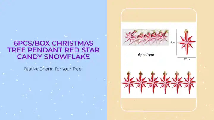The 6-piece Christmas tree pendant set includes a delightful mix of festive designs, featuring red stars, candy canes, snowflakes, and more. Each pendant is carefully crafted with vibrant colors and intricate details, adding a charming touch to your tree. Whether hanging from branches or scattered as accents throughout your home, these ornaments bring a playful and elegant vibe to your holiday décor. With six unique pieces in each box, they make decorating your Christmas tree a joyful and effortless experience.