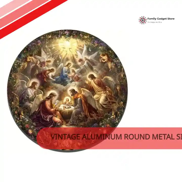 This beautifully detailed round artwork depicts a classic Nativity scene, surrounded by a host of radiant angels in a heavenly setting. At the center, the baby Jesus lies in a manger, illuminated by a divine light, with Mary and Joseph lovingly by His side. The scene is framed with vibrant flowers, ornate patterns, and golden accents, creating a sense of warmth, reverence, and celestial beauty. A symbol of peace and divine grace, this piece captures the spiritual essence of Christmas and would make a stunning decorative item during the holiday season.